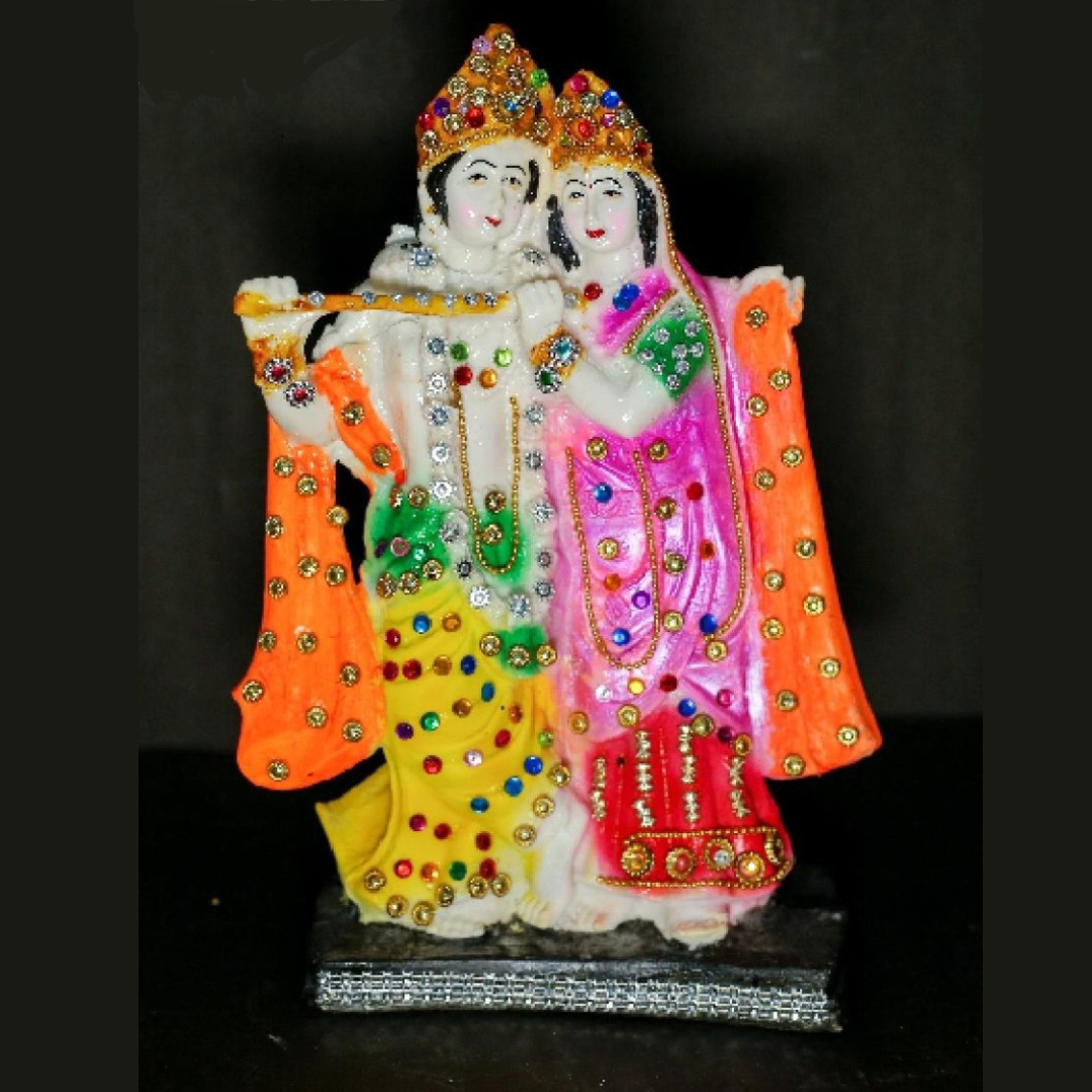 The idol is lavishly hand-decorated with sparkling imitation stones and beads, giving it a rich, bejeweled look that captures the splendor of Vrindavan. The vibrant, multi-color painting (orange, pink, yellow) and shimmering accents make it a captivating focal point for any room.