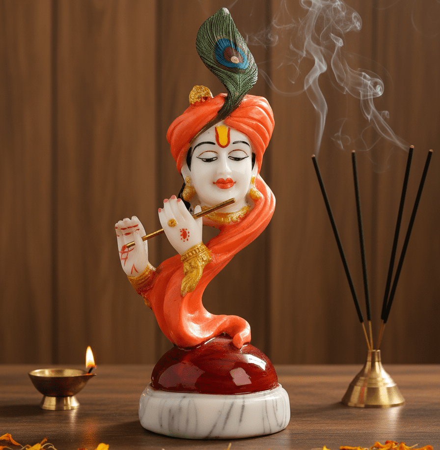 Crafted with a premium Marble Finish, the sculpture features clean lines and a beautiful contrast between the white body and the vibrant orange turban and base. This artistic style makes it particularly appealing to customers looking for a subtle spiritual accent that complements modern interior design. Placing the Flute Playing Krishna in the home is believed to bring harmony, spiritual growth, and the removal of obstacles.