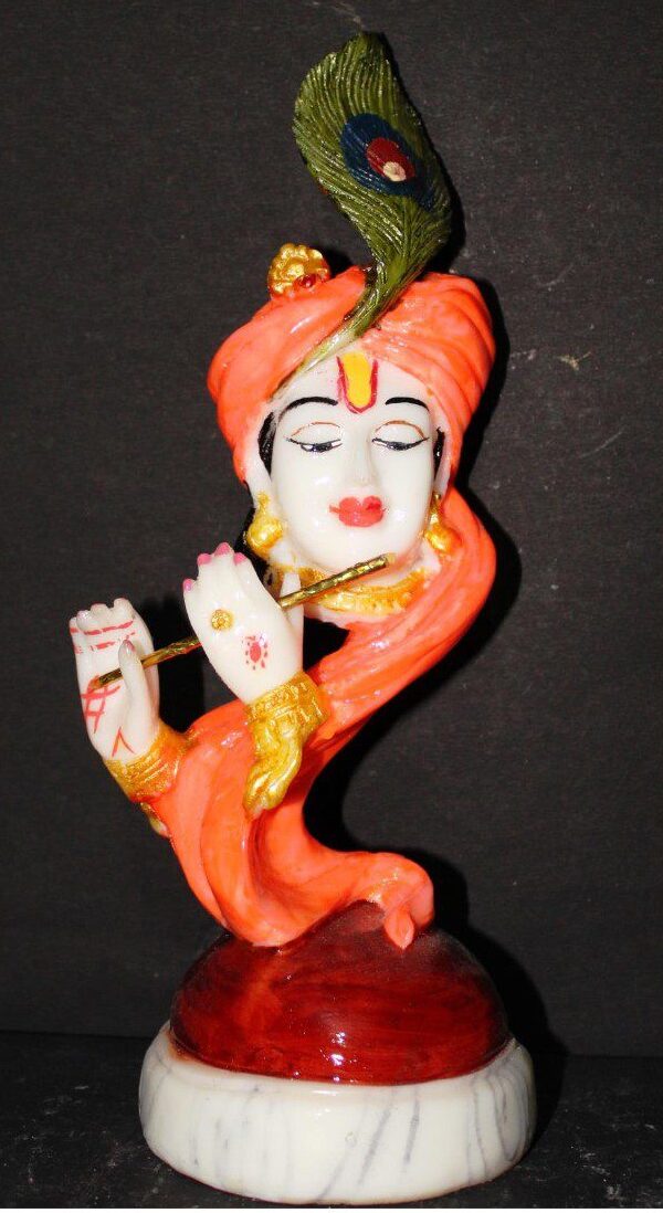 The 12 Inch Krishna Idol, Marble Finish Kishan, Flute Player Statue, Unique Krishna Murti, Orange Turban, Stylish Bal Gopal, Polyresin, Home Decor, NGT-142. FACE KISHAN Idol is a standout piece for its artistic merit and serene beauty. At 12 inches, this statue offers a unique, minimalist perspective on Lord Krishna, focusing on his charismatic form and the divine act of playing the flute.