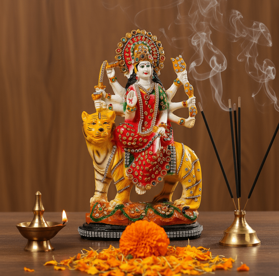 - Symbol of Feminine Power: Durga Maa, seated fearlessly on her tiger, represents the ultimate form of Shakti, bringing courage, protection, and success.