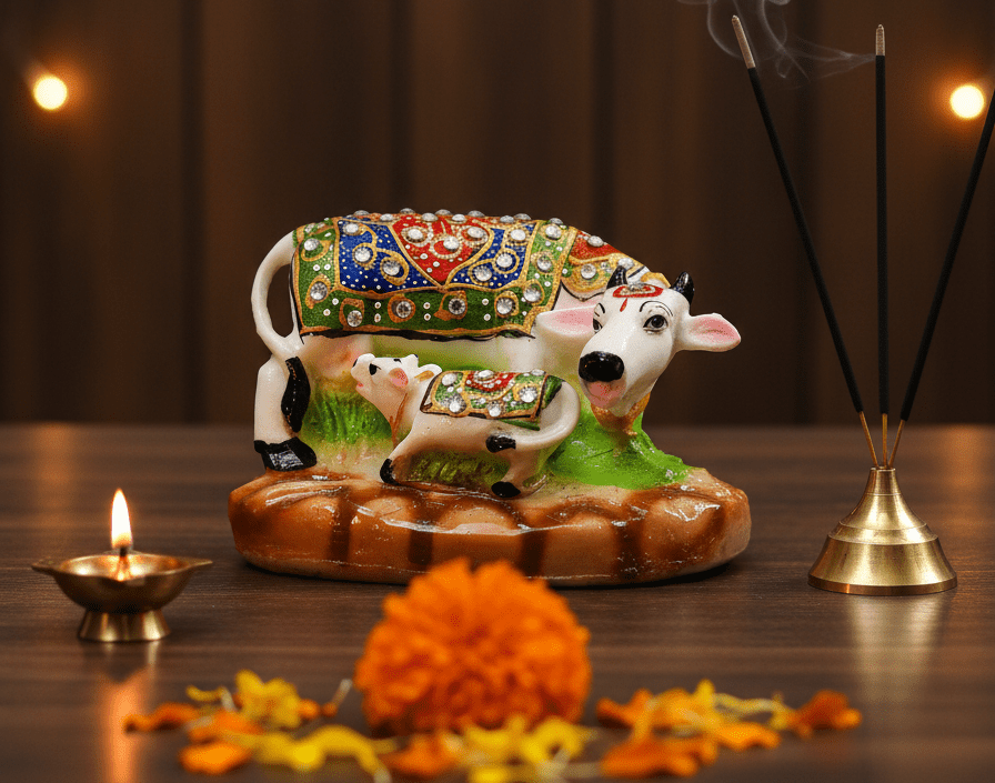 4.5-Inch Jeweled Cow and Calf Statue – Kamdhenu Gaumata Polyresin Vastu Idol