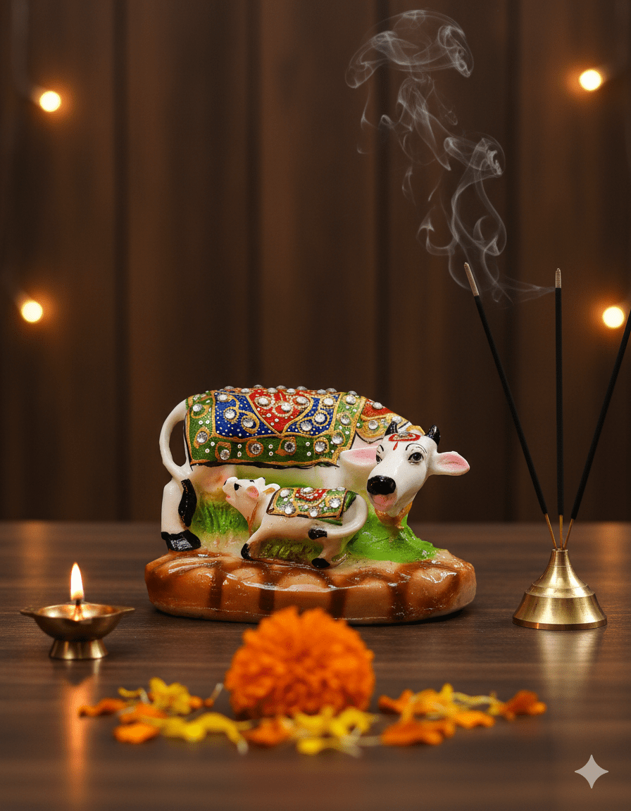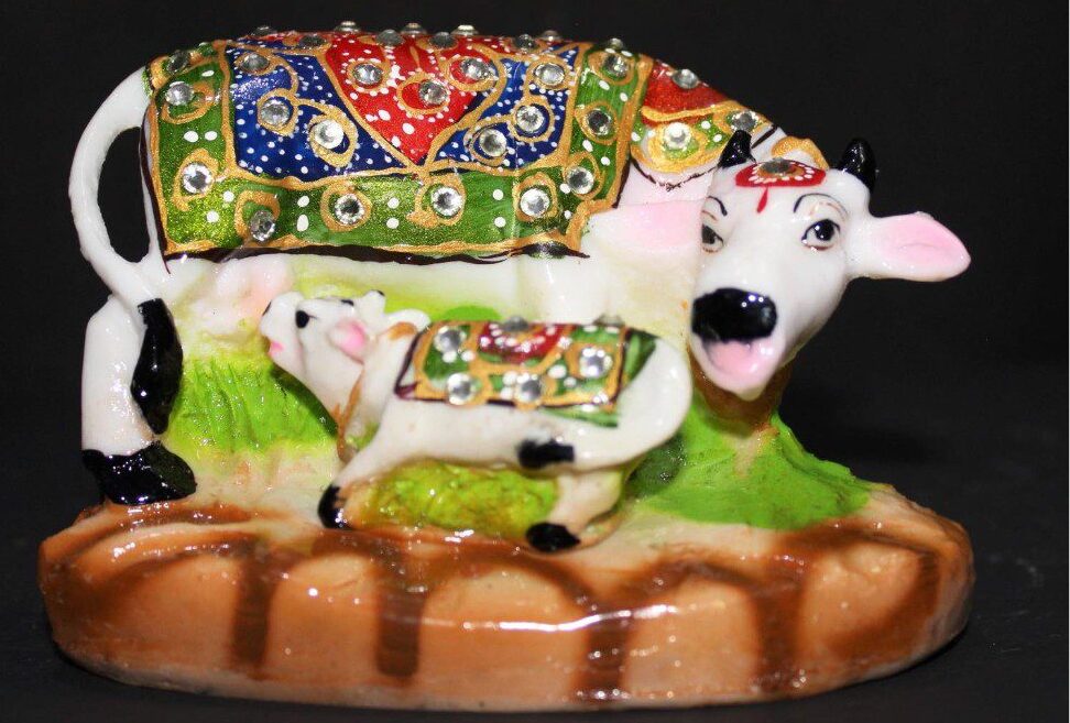 Ideal Religious Gift: Made from durable polyresin, this Multicolor Cow with Calf Decor is a charming and meaningful Miniature Hindu Religious Gift for occasions like housewarmings, Diwali, weddings, or welcoming a new baby.