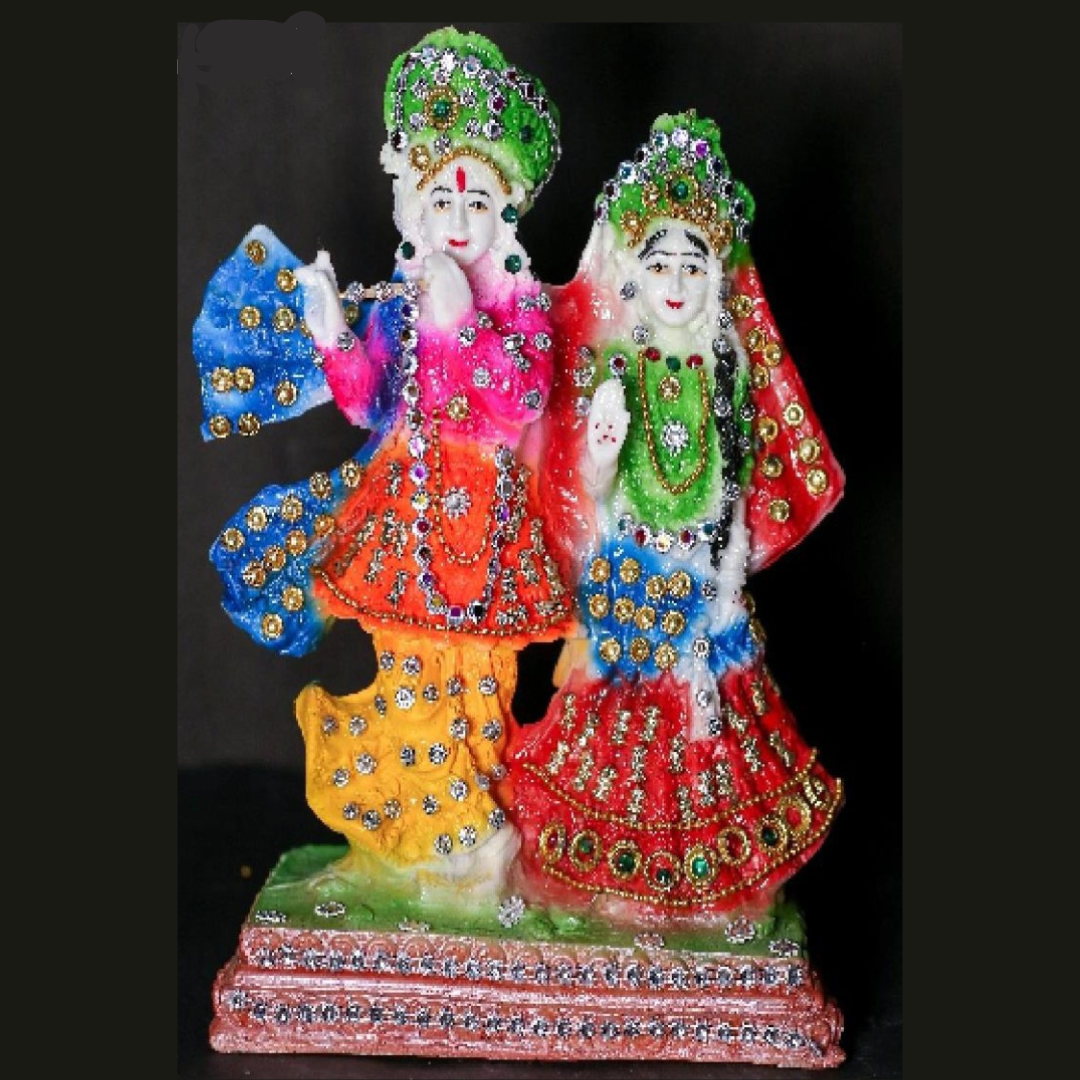 This Polyresin Radha Krishna with Cow Murti is lightweight, durable, and its glossy finish ensures it remains vibrant and easy to clean. Place this exquisite 9 inch idol in your Mandir, living space, or office to invite peace, devotion, and good fortune. It serves as a beautiful representation of divine love and is an excellent spiritual gift.