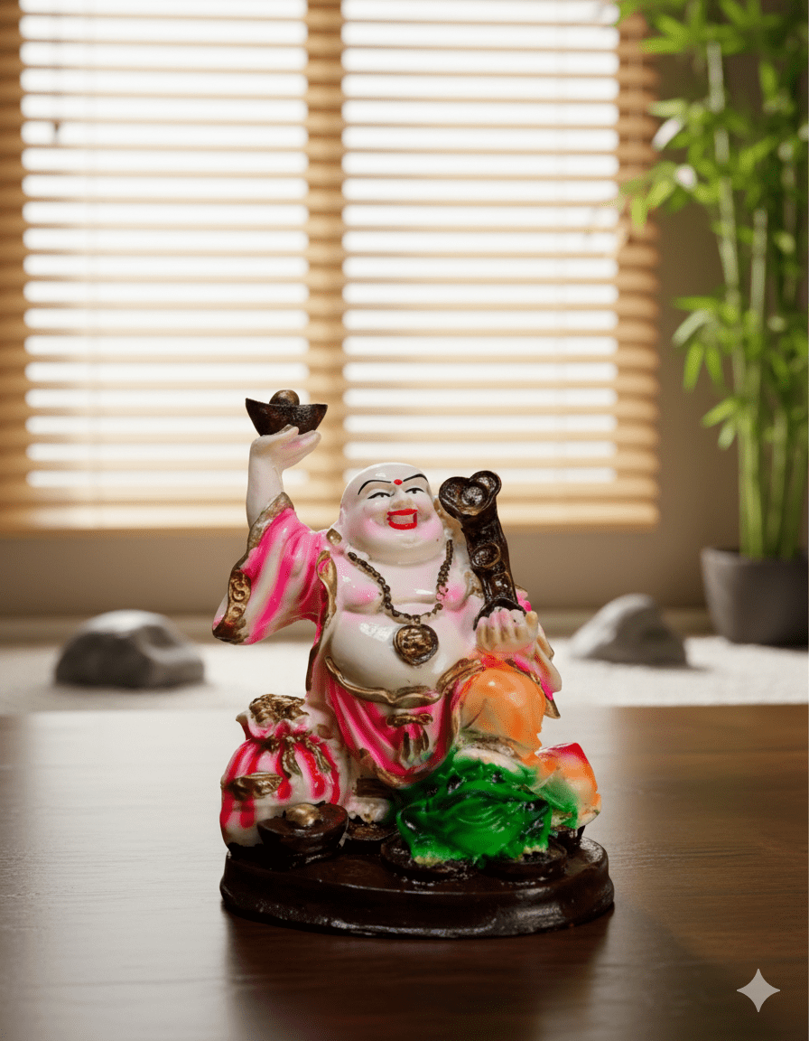 This polyresin idol is richly colored, featuring the jolly Buddha with an arm raised, offering the auspicious gold ingot (symbolizing financial wealth). He is surrounded by a sack of treasures and a small companion, which often symbolizes the blessing of good fortune and fertility. The white, glossy body is draped with brightly colored pink and gold robes, emphasizing the festive and positive energy. Placing this 7.5 Inch Prosperity Buddha in the entryway or the wealth corner (Southeast) is a powerful way to invite success, prosperity, and joy into your life and surroundings.