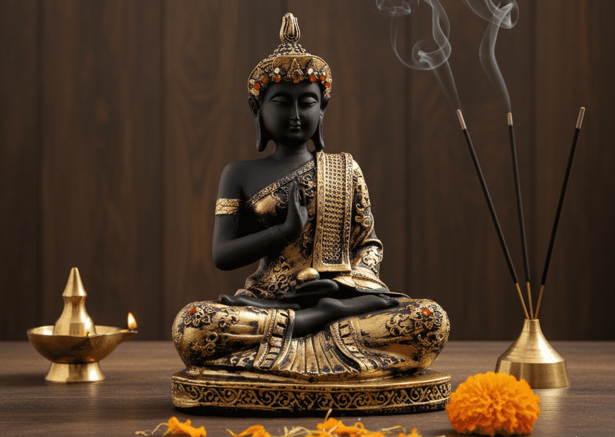 Start with a compelling opening statement Black and Gold Meditating Buddha Statue (11 Inch) Invite a sense of profound calm and spiritual elegance into your life with our exquisite Black and Gold Buddha Statue. This 11-inch masterpiece beautifully captures Lord Buddha in the Dhyana Mudra—the gesture of deep meditation, concentration, and enlightenment. This meditation Buddha idol is a perfect centerpiece for fostering mindfulness and tranquility in any space.