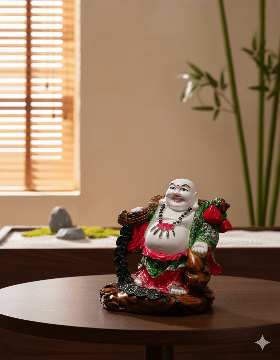 This particular idol carries profound symbolism. The Buddha is seen leaning on a glorious log or branch, often known as the Abundance Log. He also holds a cluster of red gourds/fruits, traditional symbols of a bountiful harvest, good health, and long life. Crafted from durable polyresin, the statue features a high-gloss finish with a vibrant combination of red, green, and pink garments, contrasting beautifully with his classic white body. Place this magnificent Large Prosperity Buddha in the East (Health) or Southeast (Wealth) corner of your home or business to maximize positive energy and attract success in health, wealth, and relationships.