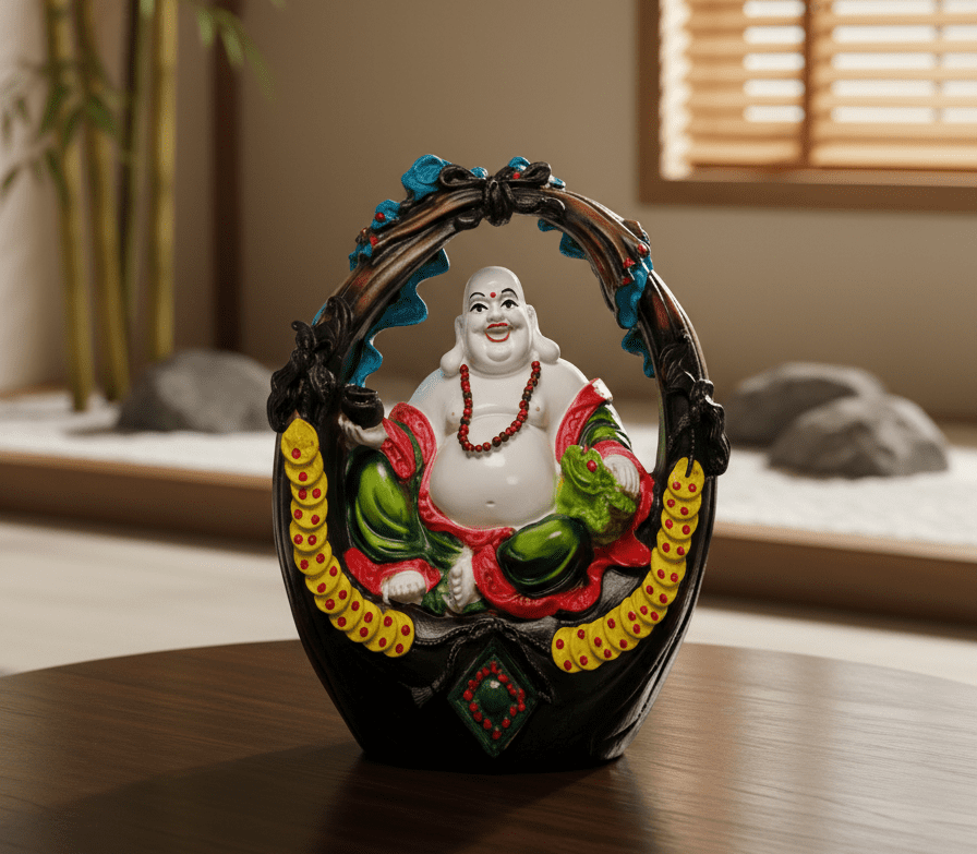 The Basket Buddha design is a statement piece, featuring the jovial Hotei seated serenely within a striking black and blue arch. The base of the basket is beautifully decorated with a continuous chain of yellow prosperity coins, symbolizing unending wealth and success. His robes are colored in vibrant reds and greens, further enhancing the festive and positive energy this statue emanates. At 16 inches, this extra-large size is perfect for placement in prominent areas such as a living room centerpiece, office reception, or a business counter, where its energy is believed to magnify good fortune and attract clients. This statue is not just decor; it is a powerful talisman for a successful life.