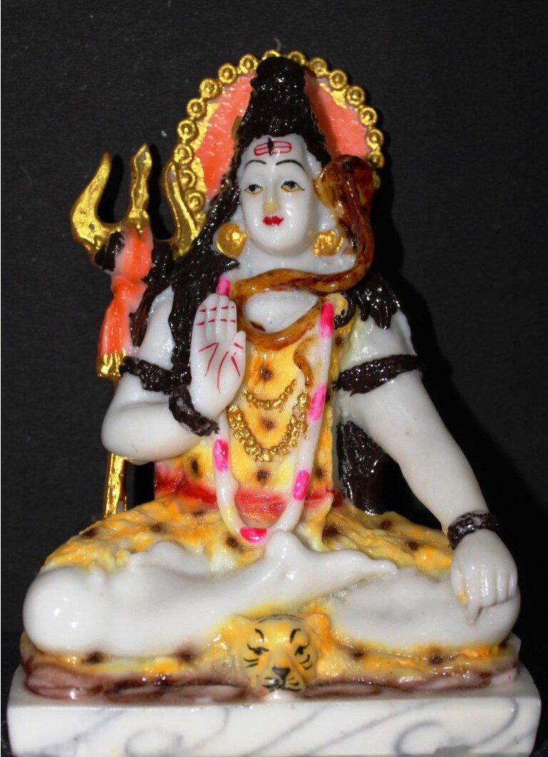 Crafted with a premium Marble Dust (M.D.) finish, the statue boasts a smooth, white body adorned with intricate details. Highlights include the traditional tiger-skin dhoti, the serpent around his neck, the golden trident (Trishul) in his hand, and the beautifully carved golden backdrop (halo). Worshipping this form of Shiva is highly revered for cultivating inner peace, removing negativity, and encouraging spiritual wisdom.